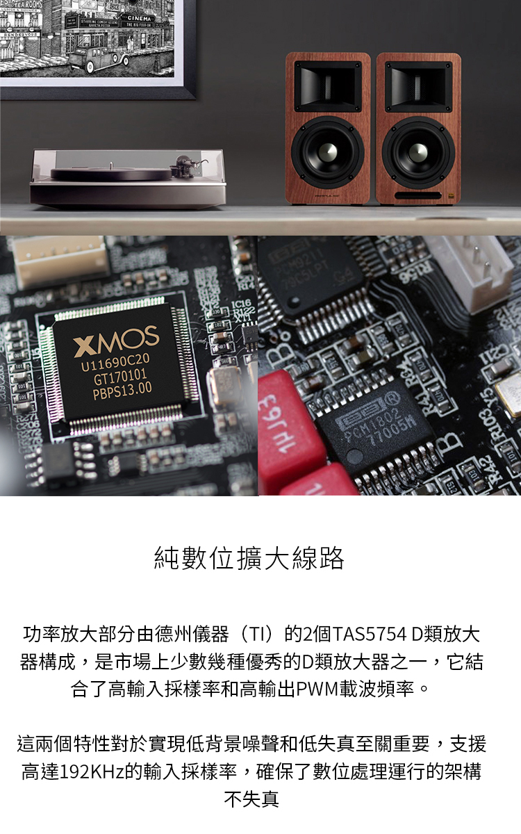 .超低失真數位功放系統,搭載XMOS處理器